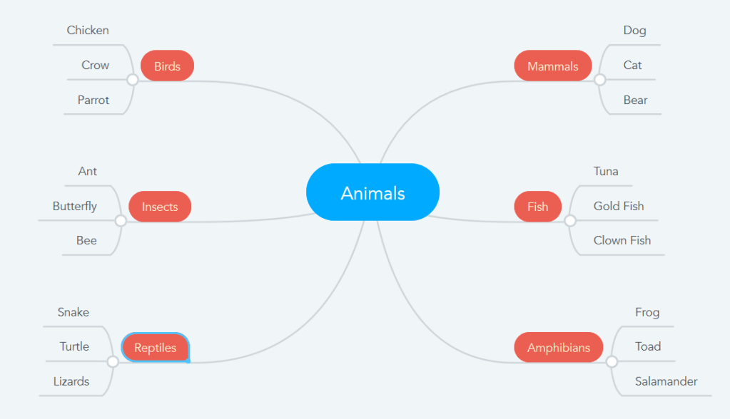 For my first example I used https://www.mindmeister.com to create a concept map of the different classifications of animals and example of each group. This is a basic visual learning tool that can help young students visualize how these different animals are categorized.