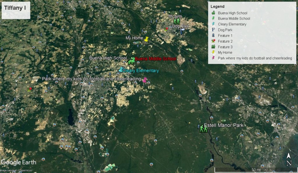 This assignment involved learning about the in’s and out’s of Google Earth Pro and creating my own personal map. I started by down loading the free program onto my personal computer which to my surprise was quite simple. Once the download was complete I was free to explore my neighborhood and surrounding areas. In the map I created below I pinned areas that are important to my family in our everyday life. I was able to add unique pins to highlight these areas and label them accordingly as well as include a legend. I included all three schools that my children are presently attending as well as the park where their extra curricular sports are held. I also included our gym as the entire family attends multiple times per week together. On the map you will also find Estelle Manor Park and our local dog park as both of these places we spend our weekends at frequently. Most importantly pinned in yellow I included our family’s home so you can see how centrally located it is to the other locations.