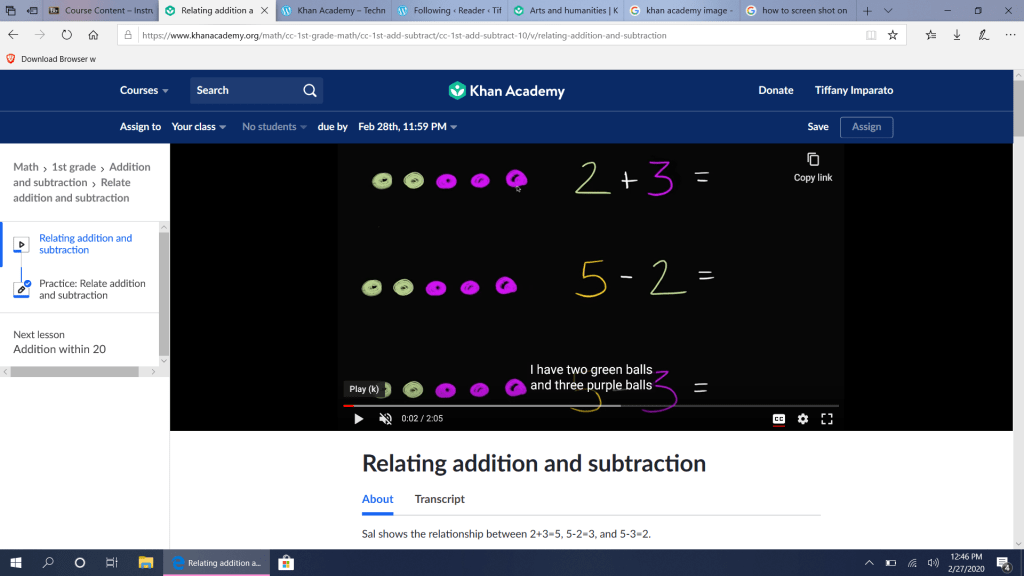 The first lesson I chose was a math lesson aimed towards first graders to help them understand the relating addition and subtraction. This lesson included an easy to follow video clip that could be quite helpful for students to visualize the concept. The video was easy to follow and explained the lesson step by step, after the completion of the video the was a small series of problems quizzed the students. The seven questions were helpful and if the student needed a hint or an additional video to help out it was easily available. If the student gets the answers correct there is a happy song played along with some cute graphics that can be really exciting and encouraging for younger children.