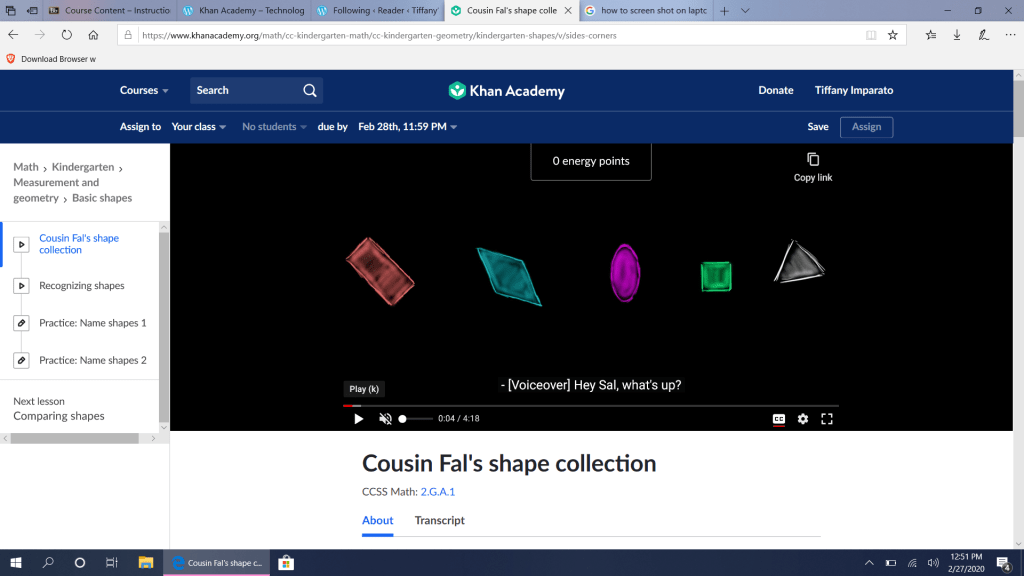 The next lesson I chose was geared toward kindergarten students about basic shapes. This lesson was comprised of two colorful videos and two sets of practice questions to reinforce the lesson and test students of their retention. Again this lesson was age appropriate and appeared to be well laid out. I like that they keep the videos short and to the point as children at this age are easily distracted.
