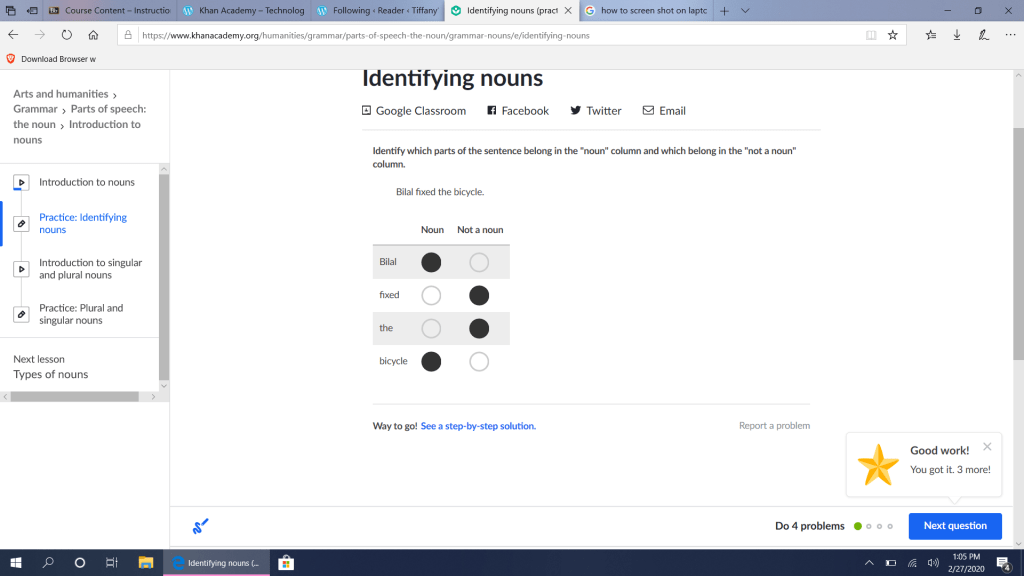 The third lesson that I selected to review was an introduction to nouns; this lesson included two detailed easy to follow video clips and two sets of practice questions. It gives students a clear explanation of what a noun is while briefly explaining both singular and plural nouns. I thought that the lesson was a well thought out introduction that can be followed up with more detailed lessons.